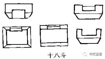 十八斗:在斗拱翘头或昂头上承托翅昂与单材瓜供或厢拱相交的斗,斗的顺身开口,放单材瓜拱、单材万拱、厢拱,横向做袖口.袖口宽0.8斗口,深o.1斗口;十八斗1.8斗口定长,1.46斗口定深.1.0斗口定高。明代早期斗底常做银锭榫,明末清初多做暗销,还有一种即没有榫也没有暗销。