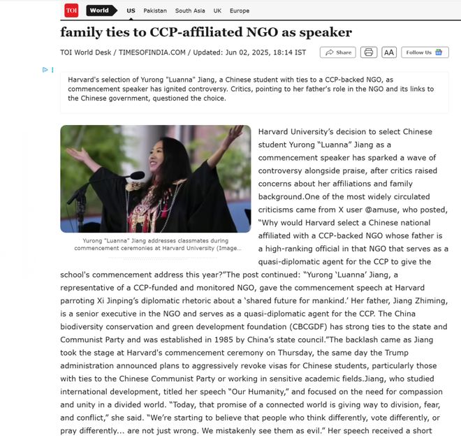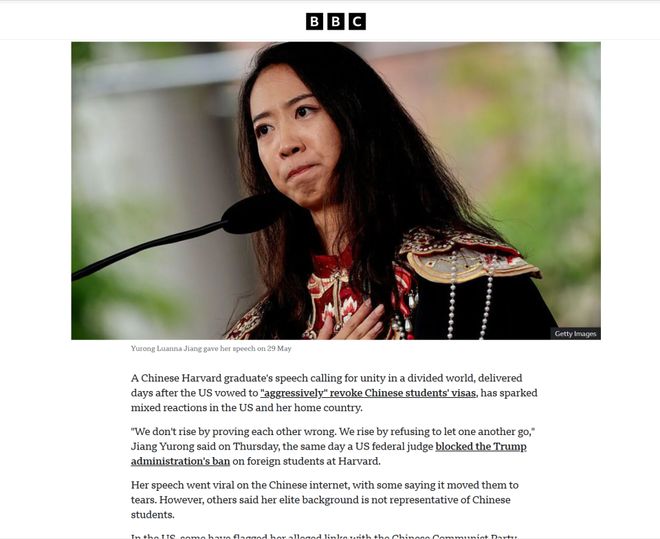 这个事件已经变味了,当事人的本意是好的,演讲的内容聚焦全球团结和人性,呼吁理解不同背景的人。以自身的生动事例唤醒美国人积极面的潜意识。当然,在中国我们不需要媒体过于诠释就可以理解,所以深受触动。但是在西方,尤其是美国当地,就带有意识形态标签。美国在X平台上有大部分都相信,她和中国政府有联系,意思暗指间谍。还批评哈佛选择她为演讲者,居心不良,动机是为了反击特朗普政府对哈佛国际学生签证的限制政策。