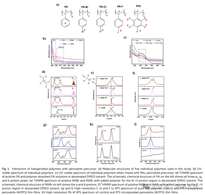 Figure 1展示了五种卤化聚苯乙烯衍生物的分子结构及其与钙钛矿前驱体的相互作用机制。UV-vis光谱显示卤素取代显著改变了聚合物的π-π堆积特性,其中PFS完全抑制了295nm处的特征峰。1H NMR分析证实PFS与FAI/MABr形成氢键和阳离子-π相互作用,XPS证实F 1s结合能从687.8eV增至688.37eV,表明氟原子与Pb²⁺的配位作用。这些结果从分子层面揭示了卤素原子如何通过电子效应调控聚合物与钙钛矿组分的相互作用。