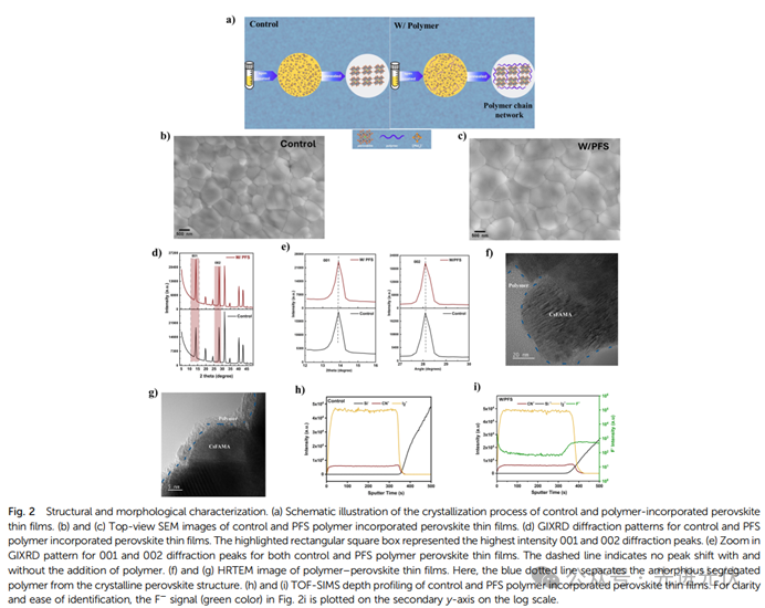 图2 研究了聚合物对钙钛矿薄膜结构与形貌的影响。SEM显示PFS使晶粒尺寸从0.76μm增大至1.2μm,晶界明显减少。GIXRD证明PFS修饰后(001)和(002)衍射峰强度增加且半高宽变窄,结晶度提高。HRTEM直接观察到非晶态聚合物沿晶界分布,形成物理阻隔。TOF-SIMS深度剖析显示F⁻信号在PFS样品中均匀分布,证实聚合物贯穿整个薄膜。这些结果从纳米到微米尺度证实了聚合物在调控结晶过程和缺陷钝化方面的关键作用。