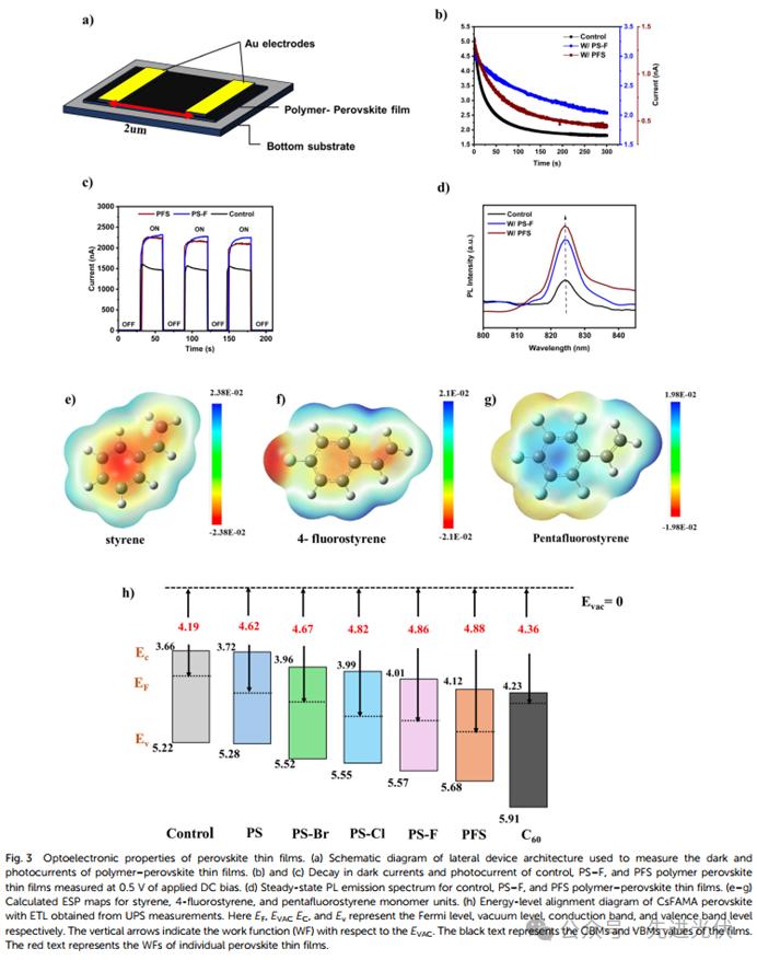 图3深入分析了聚合物修饰对钙钛矿光电性能的改善。横向器件测试显示PFS使暗电流从4.8nA降至1.38nA,离子迁移时间常数从13.19s延长至91.54s。PL光谱显示PFS使荧光强度增强2.7倍,证实缺陷减少。ESP映射显示PFS具有最大的偶极矩(+2.14D)和独特的电荷分离分布。能级排列表明PFS使钙钛矿/ETL界面导带偏移从0.57eV降至0.11eV,Voc提升至1.17V。这些结果从电荷传输、缺陷态和能级匹配角度揭示了效率提升的物理机制。