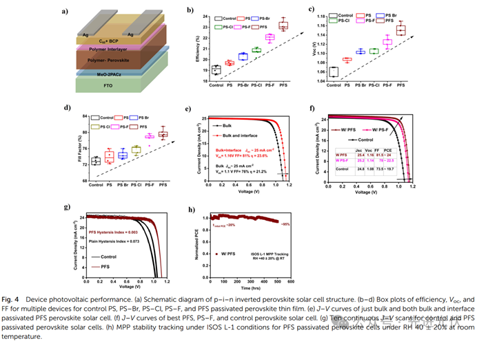 图4展示了器件光伏性能的全面优化。p-i-n倒置器件结构测试表明PFS使平均效率从19.2%提升至23.1%,Voc从1.06V增至1.15V,FF从72.5%提升至80%。连续J-V扫描显示PFS使迟滞指数从0.073降至0.003。MPP追踪表明PFS器件500小时后保持95%效率。这些数据证实卤化聚合物在提升效率和稳定性方面的卓越效果。